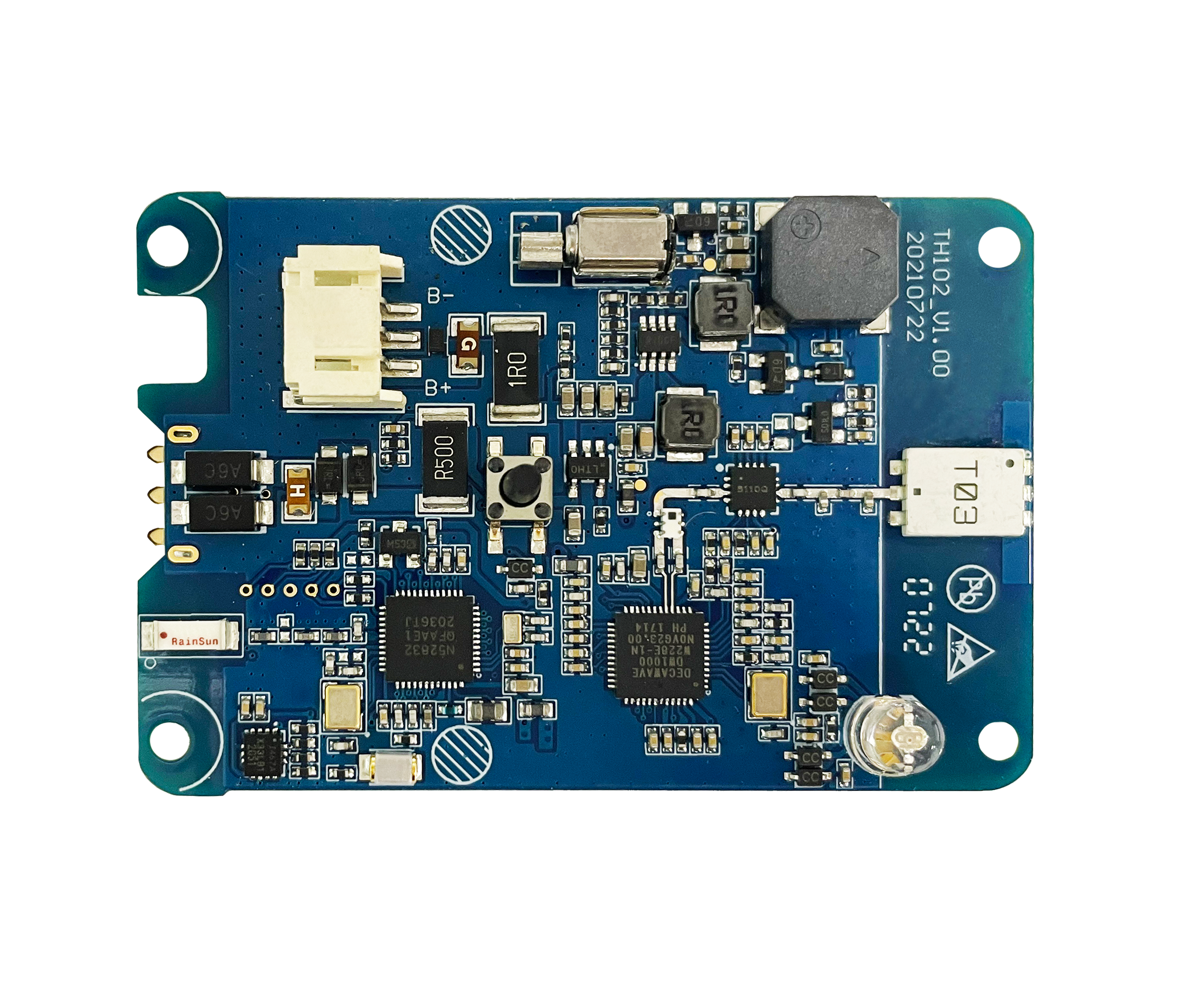 | Physical parameters | Dimensions Weight Mounting holes Interfaces Power supply LED indicators | 54mm*34mm*8mm <6g 3 Φ2mm 5PIN 1.27mm pin header: B+, LED1, LED2, KEY, GND DC 2.0V-5.0V Working status, low power and alarm indication |